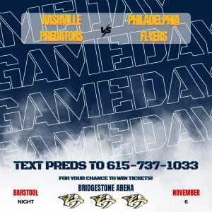 Smashville - it's game time - and 103.3 Country wants to send you to the Nashville Predators v. Philadelphia Flyers game on November 6th for Barstool Night at Bridgestone Arena!
