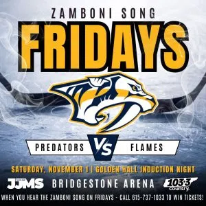 Every Friday on the Jesse James Morning Show, 103.3 Country is getting you fired up for Nashville Predators hockey! When you hear the infamous Zamboni Song, call 615-737-1033 and you could score tickets to an upcoming game!